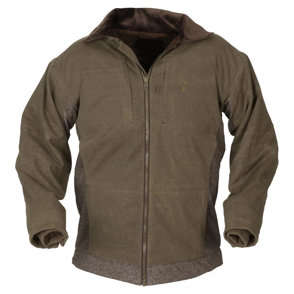 Avery Heritage Waterfowl Full Zip Sweater. A fusion of modern fabrics and vintage waxed cotton. Constructed of a windproof soft shell polyester fleece overlaid in 8 oz. olive drab waxed cotton. The collar and pockets are lined with coral fleece that feels like BUTTER! Durable 8 ounce waxed cotton outer layer is water shedding and abrasion resistant, polyester soft shell fleece adds interior warmth holding the chill at bay, 2 upper chest pockets, hand-warming side pockets, 1 magnetic chest pocket and 1 zippered chest pocket. Features: 8 oz waxed cotton outer layer Polyester softshell fleece adds interior warmth holding the chill at bay Upper chest pockets are fleece lined and hand warming Side pockets store essential gear out of the elements YKK zippered front for easy put on and take off