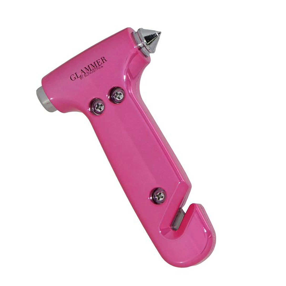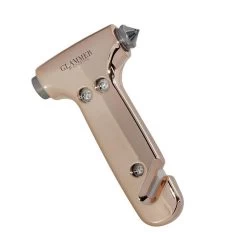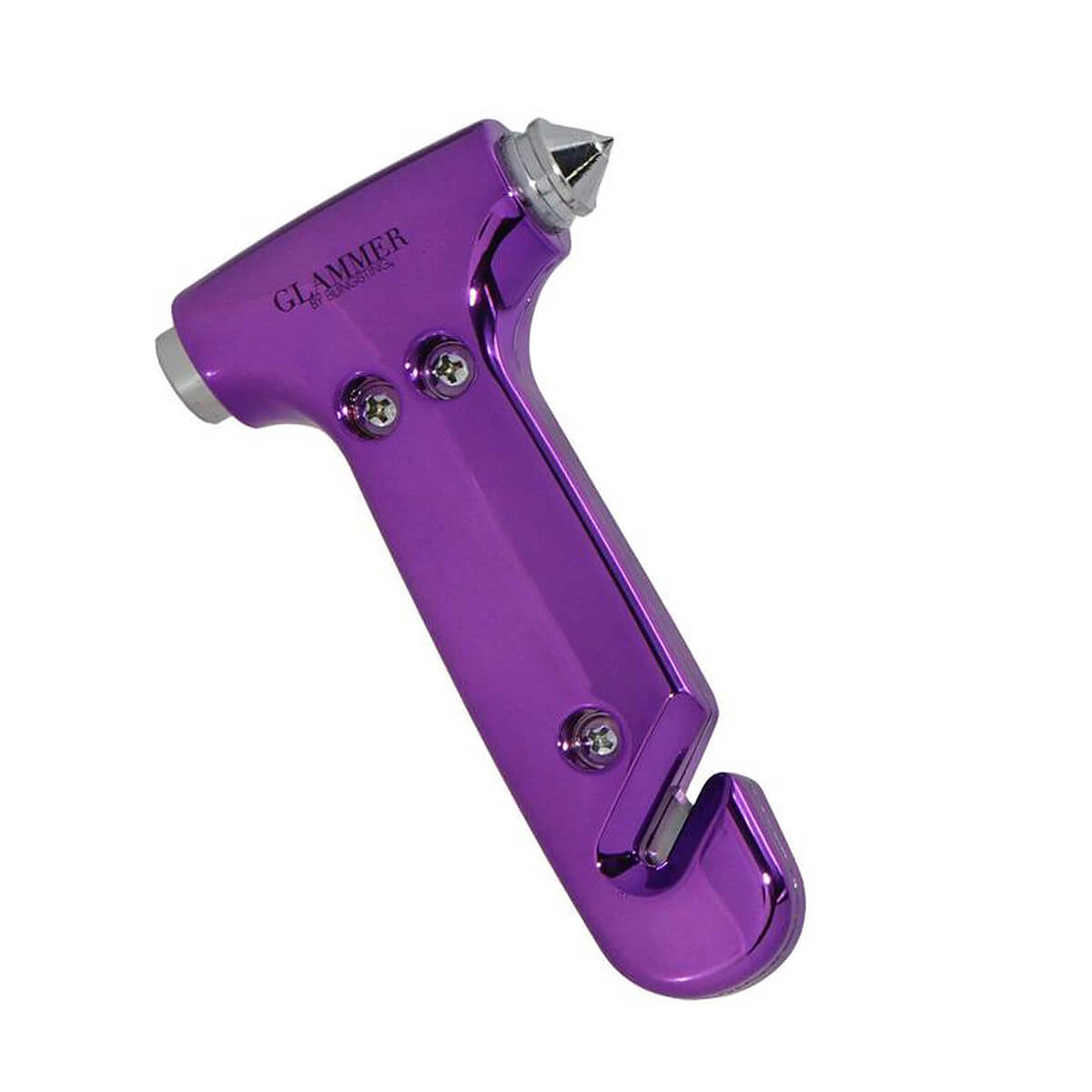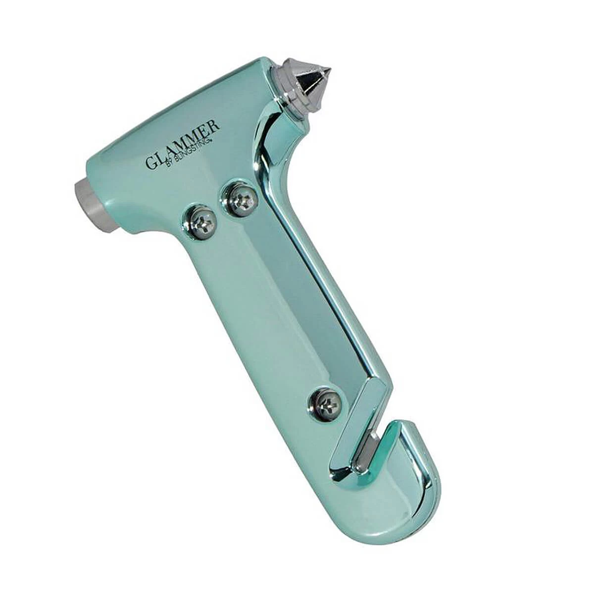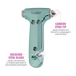 Super-cute bright mint metallic emergency escape hammer for the car. Break the side windows with the carbide reinforced steel tipCut the seatbelt of trapped passengers with the protected bladeComes with a velcro visor strap that keeps the hammer secure and accessible