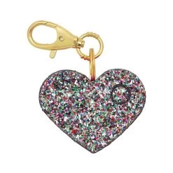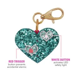 Confetti glitter personal alarm on a gold keychain clip. Piercing 115 decibel alarm sounds instantly with a push of a buttonLED safety light includedOversized lobster clip easily attaches to backpacks, keychains, purses, dog leashesNo age, TSA, or carrying restrictionsReplaceable A23 battery includedSturdy design; glitter does not flake or rub off