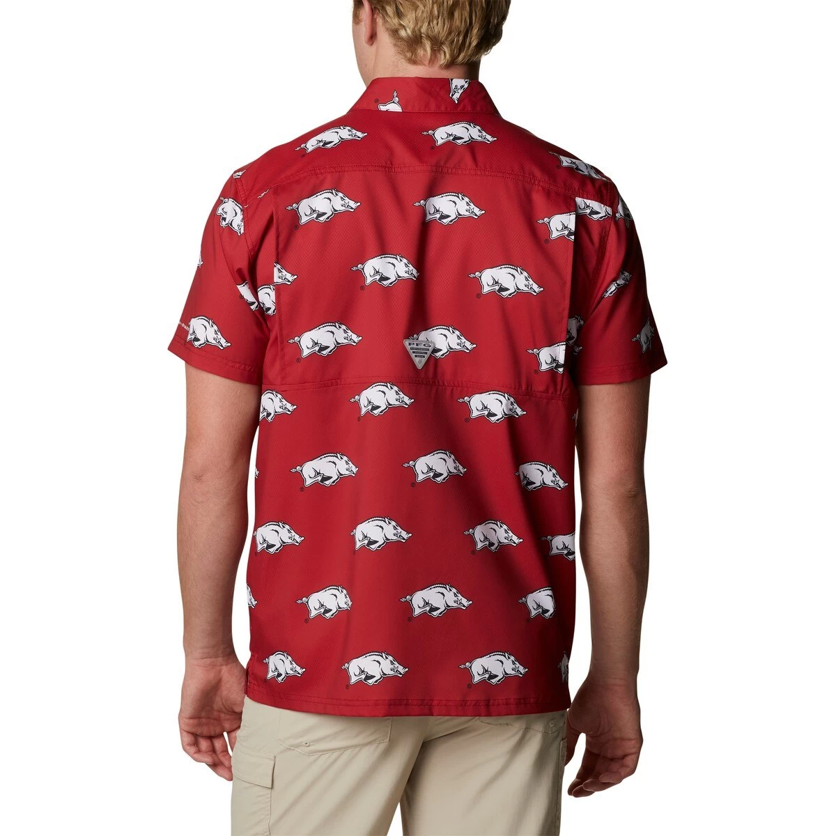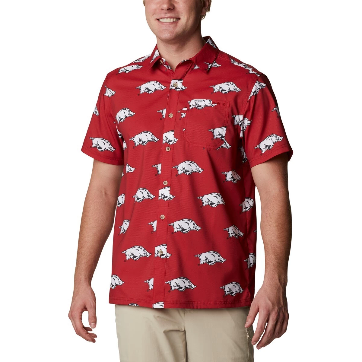 Columbia Collegiate Super Slack Tide Shirt ArkansasTROPICAL TAILGATEIdeal for summer, this short-sleeve has it all: whimsical tropical pattern, built-in sun protection, sunglasses-cleaning patch, and school spirit. Omni-Shade™ UPF 40 sun protectionButton-down collarVentedSunglass cleaning patchCenter Back Length: 30″Uses: Water, FishingImportedFabric 100% Polyester
