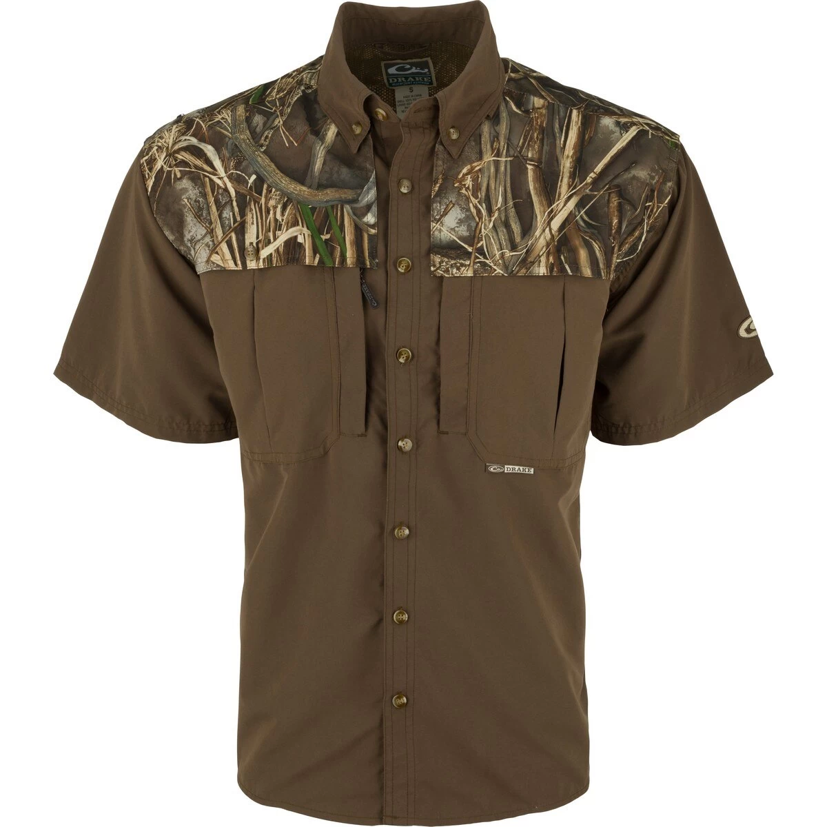 Perfect for a day in the field or on the water the EST Short Sleeve Camo Vented Wingshooter’s Shirt by Drake is breathable cool and quick-drying. Classic seven button design also has front and back ventilation to keep you cool and manage moisture in warm weather. The Wingshooter’s Shirt is extremely functional and designed with oversized chest pockets a vertical zippered pocket on the right chest and a vertical Magnattach pocket on the left chest. The extension collar can be rolled up during a long day of shooting or fishing to protect your neck from sunburn. Features camouflage accents on the front chest and vented back cape area.Features: Extension collar for sun-blocking protection Front and back vents Mesh panels under the arms Vertical zippered pocket on right chest Vertical Magnattach pocket on left chest Large chest pockets with button closureQuick-drying breathable 100% polyester100% polyester mesh under the arms and in vented areas We’re sorry but personalized items cannot be returned unless the item is defective. Once placed your order cannot be cancelled. Please enter your info carefully and double check it in your shopping cart. Thank you!