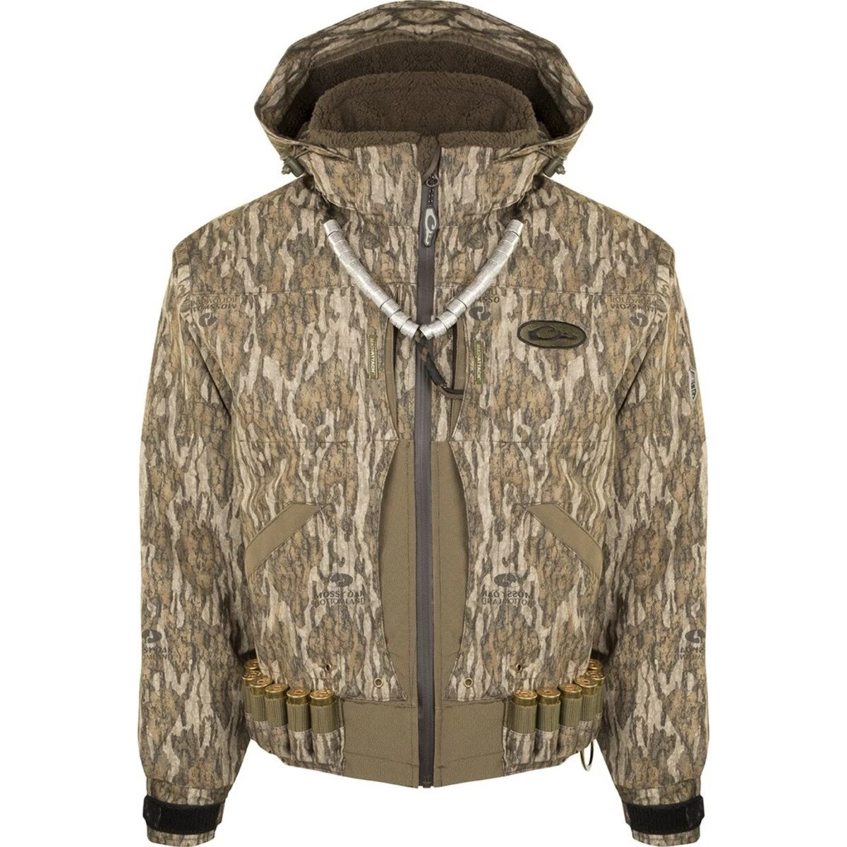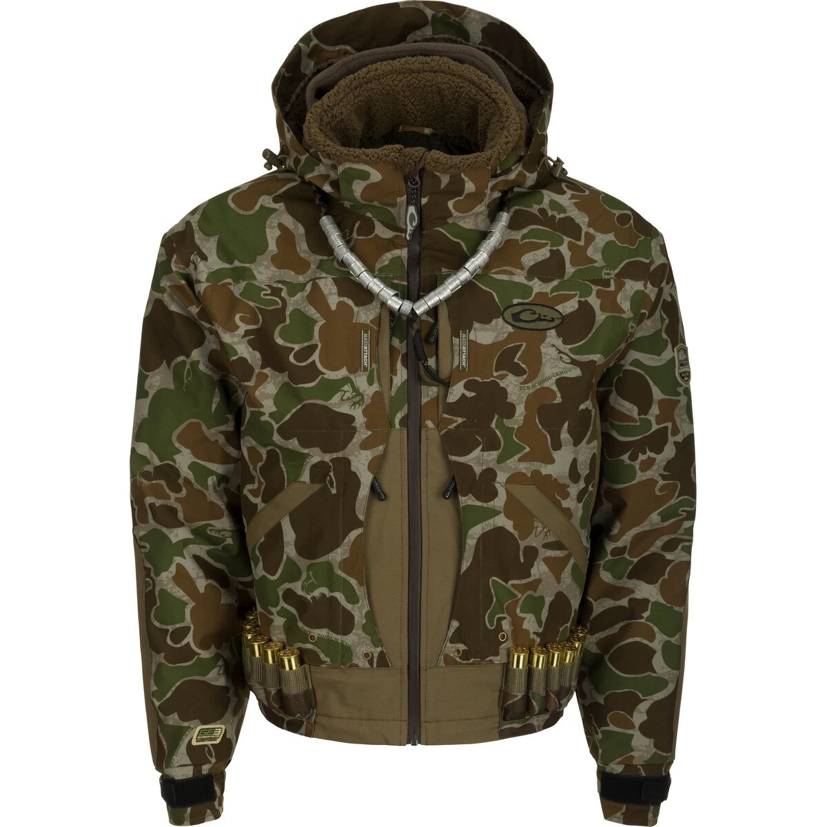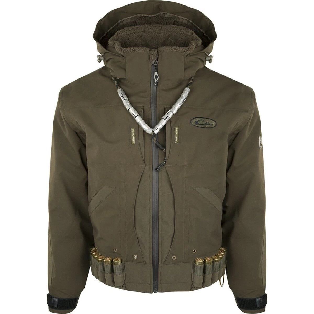 The Drake Guardian Elite Flooded Timber Insulated Hunting Jacket is specifically designed for the hunter who spends his days with his back against a tree. Cut 2 inches lower than the other jackets in anticipation of wading, Drake Waterfowl has also equipped the lower pockets with drain holes just in case the water is a little deeper than expected getting to your hole. Materials: 100% waterproof/windproof/breathable Guardian Elite 3-layer fabric treated with DWR (Durable Water Repellent) Taped seams Drake’s Fowl-Proof YKK zippers Features: 2 Time & Motion Magnattach Call and Whistle Pockets 2 Time & Motion Fowl-Proof Zippered Chest Pockets 2 Time & Motion Front-Load Fowl-Proof Cargo Pockets 2 Time & Motion Sherpa-Fleece Handwarmer Pockets 2 Time & Motion Dedicated Magnattach Shell Pouches Lower Back XXL Fowl-Proof Cargo Pocket Adjustable Zip-Off Hood with Built-In Face Mask Carabiner Clip with Adjustable Tether and Storage Pouch 12 Back-Up/Just-In-Case Shell Loops Adjustable No-Water Sealed Cuffs Boat Kill-Switch D-Ring HD3-High-Wear Reinforced Fabric Sherpa-Fleece Lined Hood and Collar Deep-Water, High-Waist Cut Patents Pending