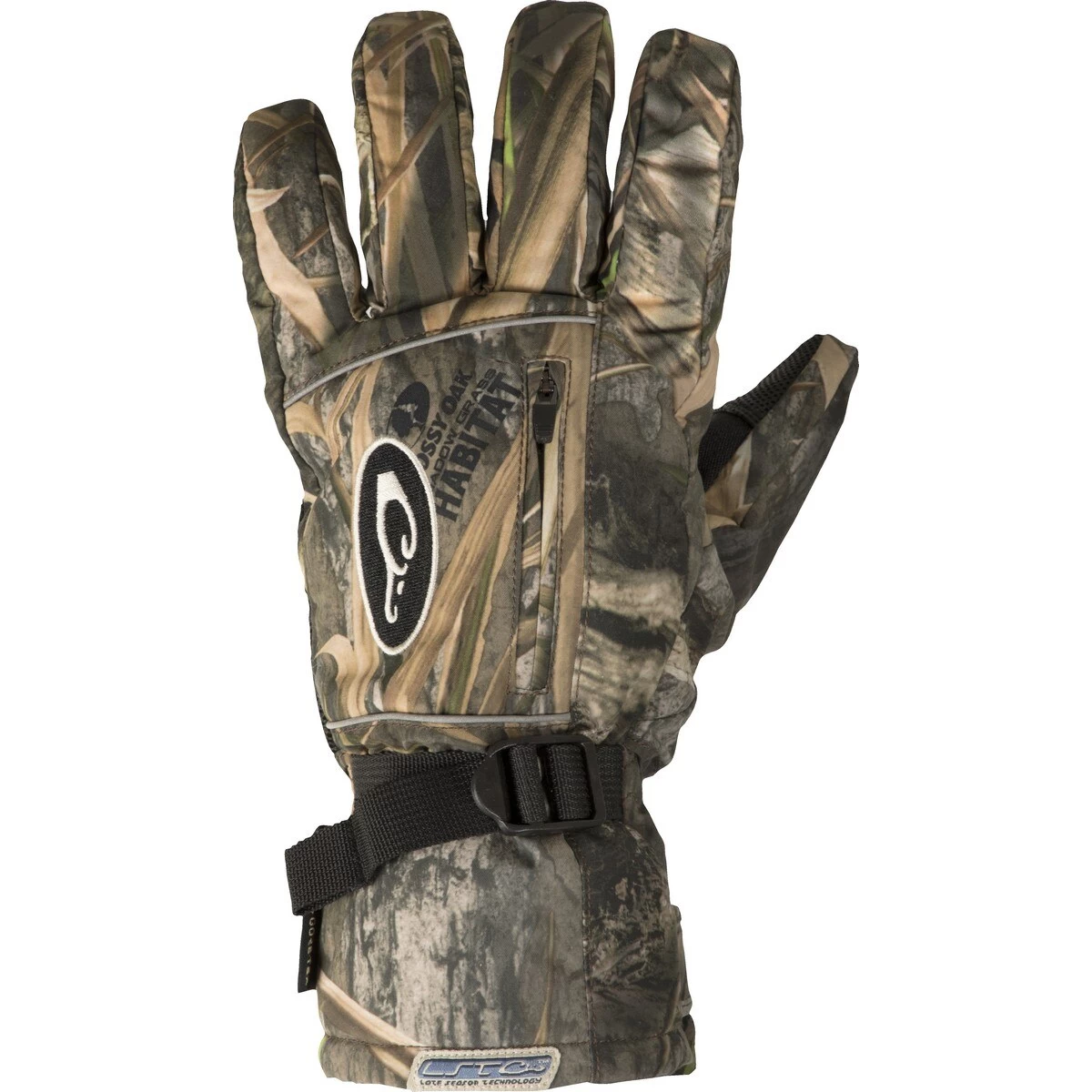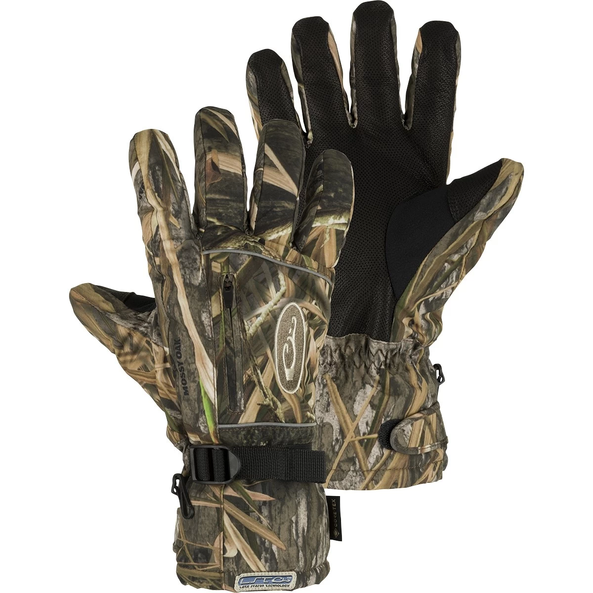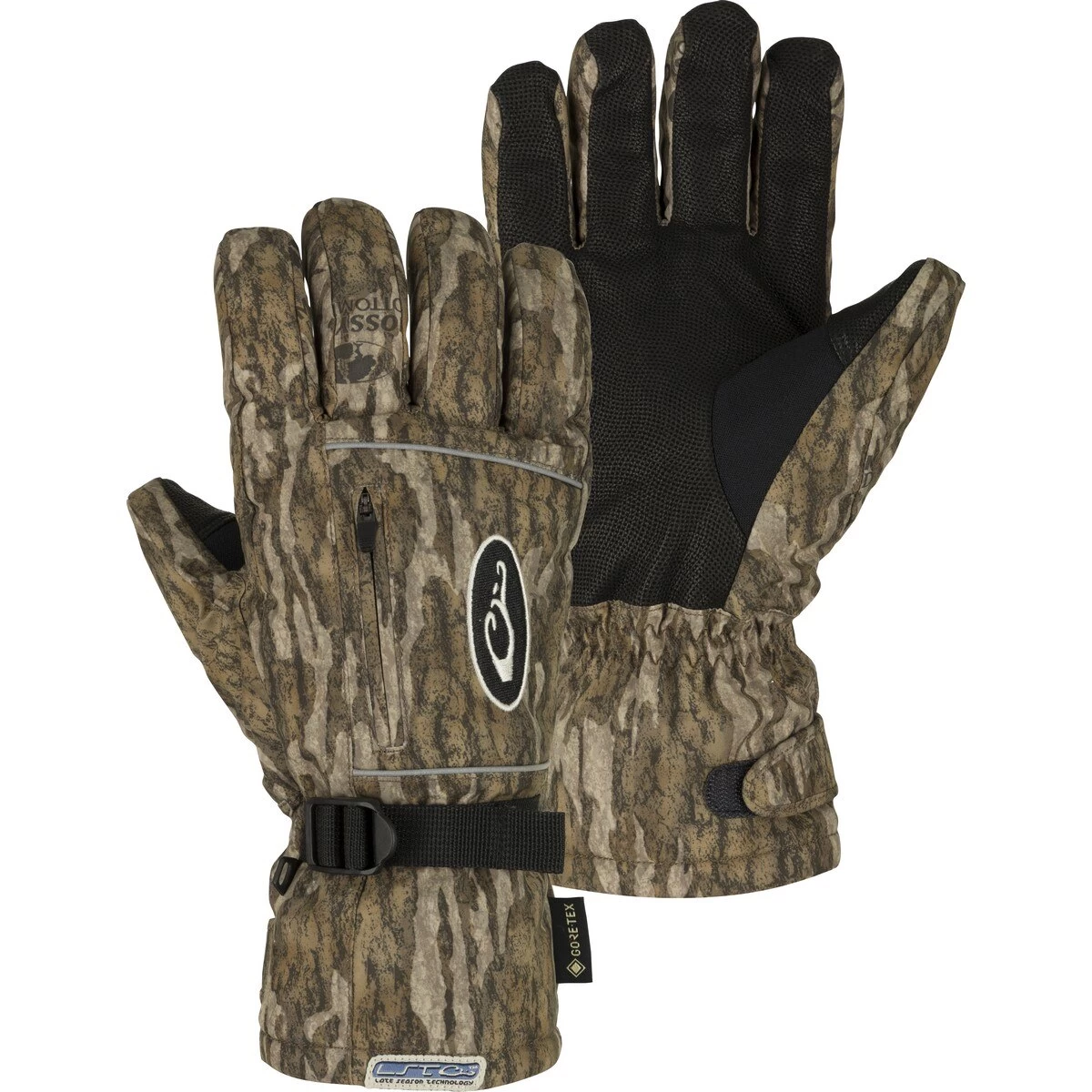 Drake LST Refuge HS Gore-Tex GlovesMATERIALS:• Refuge HS™ outer fabric treated with DWR (Durable Water Repellent) • Waterproof, breathable GORE-TEX® membrane• Digitized goat skin leather palm• 200-gram fleece lining• 140-gram insulation in palmFEATURES:• Stay-Put™ liner system bonds the liner to the glove so there is no twisting and bunching inside the glove• Webbing cinch with tri-glide at wrist• Hook and loop closure cuff to lock in heat• HotHands® zippered pocket on back of hand