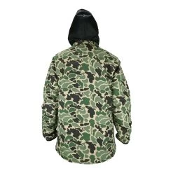 100% Nylon PU coated quilted jacket with stowable hood, embossed leather patch on chest zipper pocket, open welt hand pockets. Rear game pockets at side seam entry. DRW.