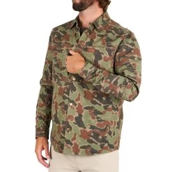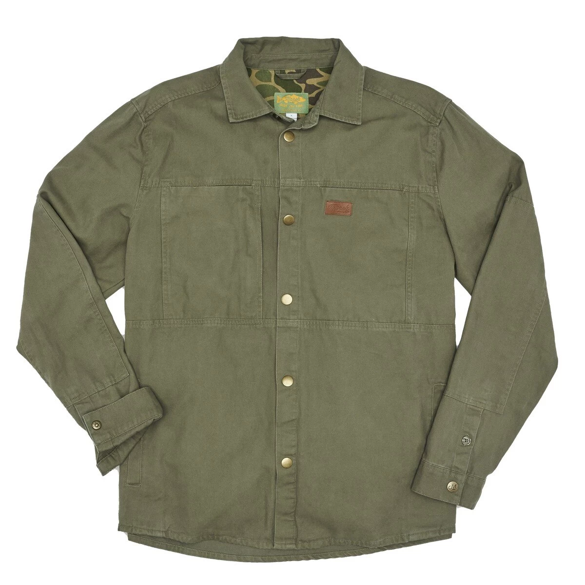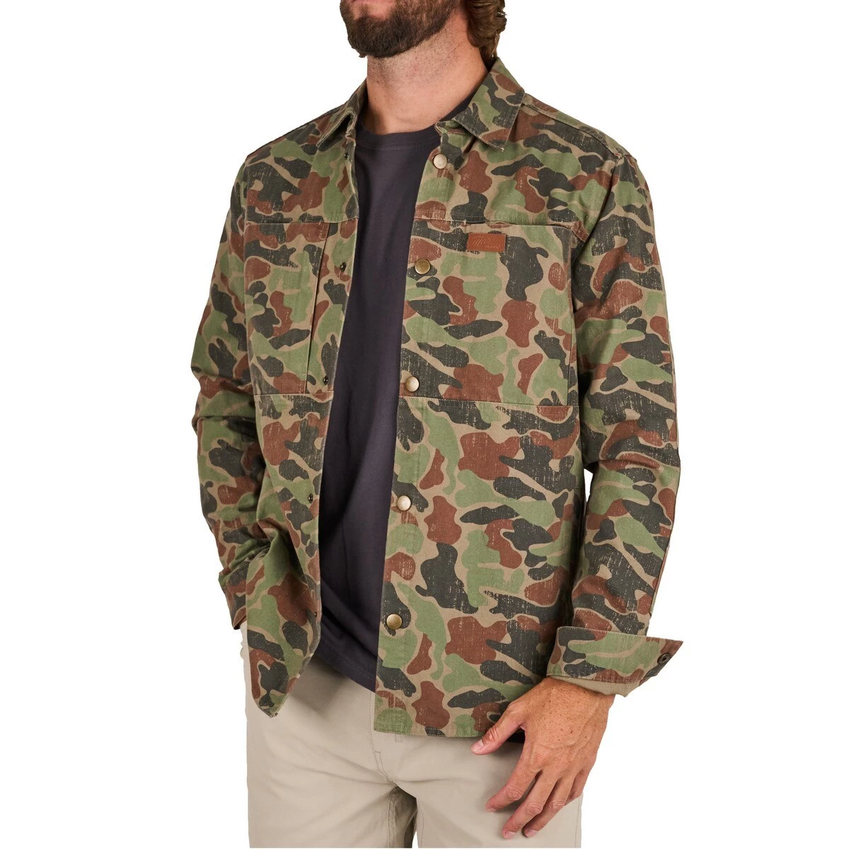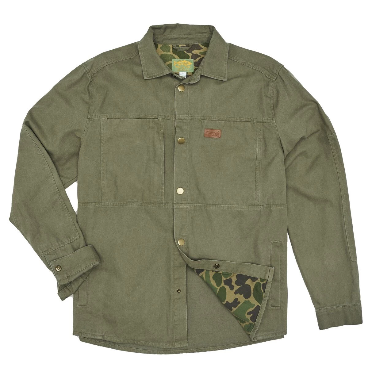 100% cotton 2×2 canvas with dual top entry pockets, one right chest zipper pocket, and dual open hand pockets. Antique brass buttons finish. Enzyme wash, mallard camo printed interior, yoke and pocket liner.