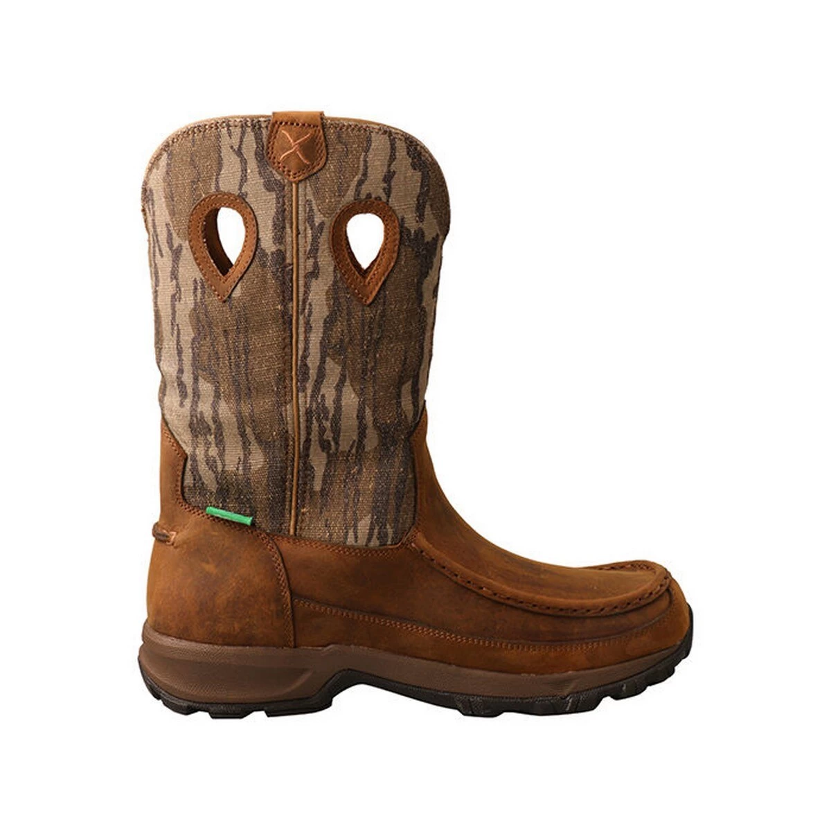 Twisted X Pull On Waterproof Hiker Boot The Men’s Mossy Oak® Waterproof 11″ Pull-On Hiker Boot is handcrafted in environmentally friendly ecoTWX® Tweed that features the iconic Mossy Oak® Original Bottomland® Camo and premium full-grain leathers and features a breathable waterproof lining and air-mesh lined shaft. The Twisted X® CellSole® footbed and composite XD insole provide all day cushion and support. The full-length molded EVA midsole provides a layer of shock absorption for the entire foot. This is paired up to an oil and slip-resistant molded rubber outsole for traction in challenging conditions. To improve the footwear lifespan this outsole has an integrated toe cap and heel kick. These features blend to produce a versatile boot that has increased functionality compared to other casual footwear. Features ecoTWX® Tweed upper featuring Mossy Oak® iconic Original Bottomland® camo and premium full-grain leather. ecoTWX® Tweed is a durable, eco-friendly material made from recycled water bottles. Every pair of shoes made from ecoTWX® Tweed uses up to 13 recycled water bottles. In addition to the positive impact of removing plastic water bottles from the environment, for every pair purchased, Twisted X will plant a tree and help repopulate troubled tree populations in the United States. Reinforced pull-holes. Air-mesh lined shaft for improved breathability. Waterproof, breathable interior lining to keep your feet dry. Toe cap and heel kick for added protection. CellSole® footbeds made from patented cell comfort technology that respond by activating more than 100 individual pressure points of cloud-like comfort. Full-length compression-molded EVA midsole. Composite XD insole provides unrivaled support and stability. Oil/Slip-resistant molded rubber outsole for increased durability and traction.