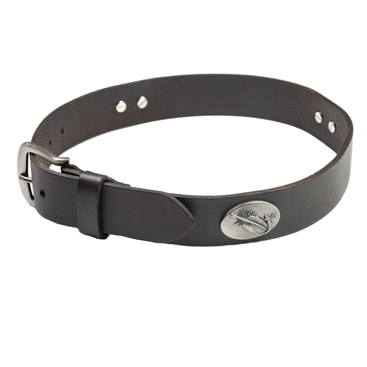 MPW Logo Men’s Leather Belt. Fine leather belt embellished with metal MPW logo concho. This genuine leather belt features a brown pull up finish and silver gun metal buckle. Decorated with silver gun metal Mack’s Feather conchos throughout the belt. Fits shorts and pants that have a minimum loop size of 1.25 inches.