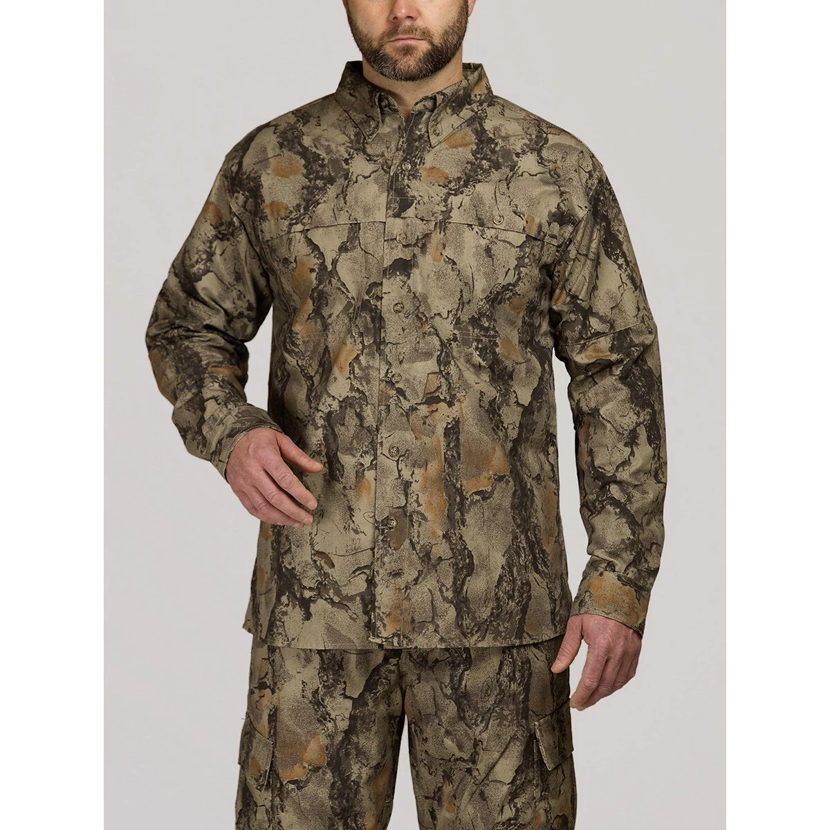 The Natural Gear Tactical Bush Shirt is a must-have item for every hunter. This technical hunting shirt is constructed of a comfortable and tough rip-stop cotton poly blend that will last through repeated washings and resist tears and snags in the field. In addition, this long sleeve hunting shirt is a perfect weight, designed to wear alone during warmer weather or use as a layering piece on colder days. No matter where you’re hunting or what you’re hunting, you can count on our naturally derived camouflage pattern to keep you expertly hidden. Cotton Poly 8oz Rip-Stop Stretch Material 7 Button Front Dual Flat Front Chest Pockets With Button Closures Button Cuffs Long Tapered Tail Quiet and Comfortable Full-Cut