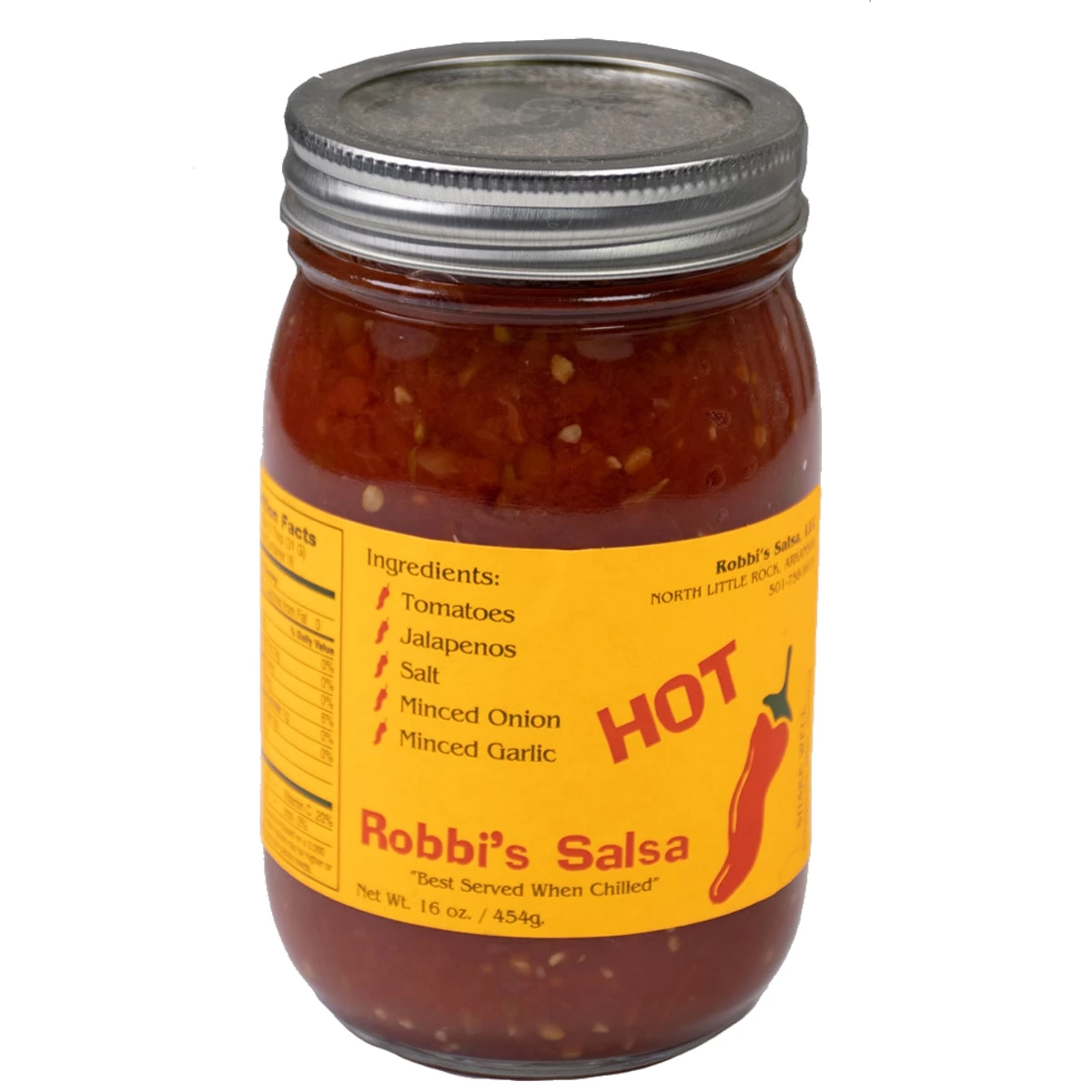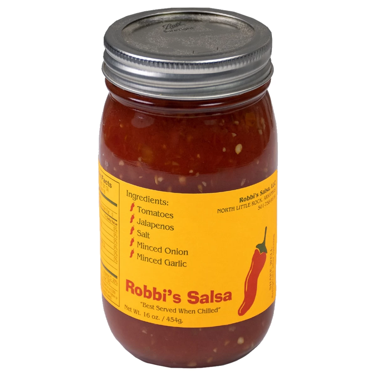 Robbi’s Salsa is a Little Rock treasure. Made in Arkansas, Robbi’s Salsa – Mild contains a secret blend of tomatoes, jalapeno peppers, salt, minced onion, and minced garlic. This is some of the freshest tasting salsa around–you will love its homemade, just out of the kitchen flavor. Best served when chilled (we agree!). Try it and fall in love. 16 ounces. Be sure to refrigerate after opening!